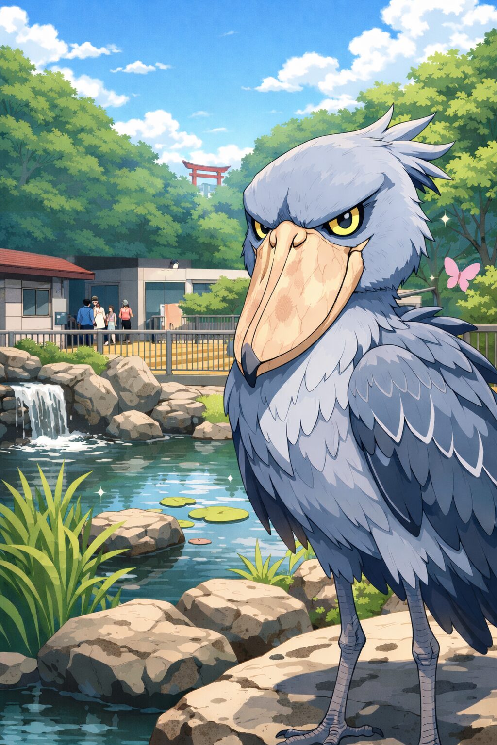 「西園」の片隅、ハシビロコウが微動だにせず立っています。剥製(はくせい)と見紛うほどの静止。鋭い嘴、据わったような眼差しは、獲物を待つという生物学的な目的を超えて、まるで世界の根源にある「沈黙」をじっと見つめているかのようです。周囲の喧騒も、他の鳥たちの羽ばたきも、彼の静寂を乱すことはありません。動かないことで、彼はかえって周囲のあらゆる動きを浮き彫りにし、空間そのものの重みを際立たせています。