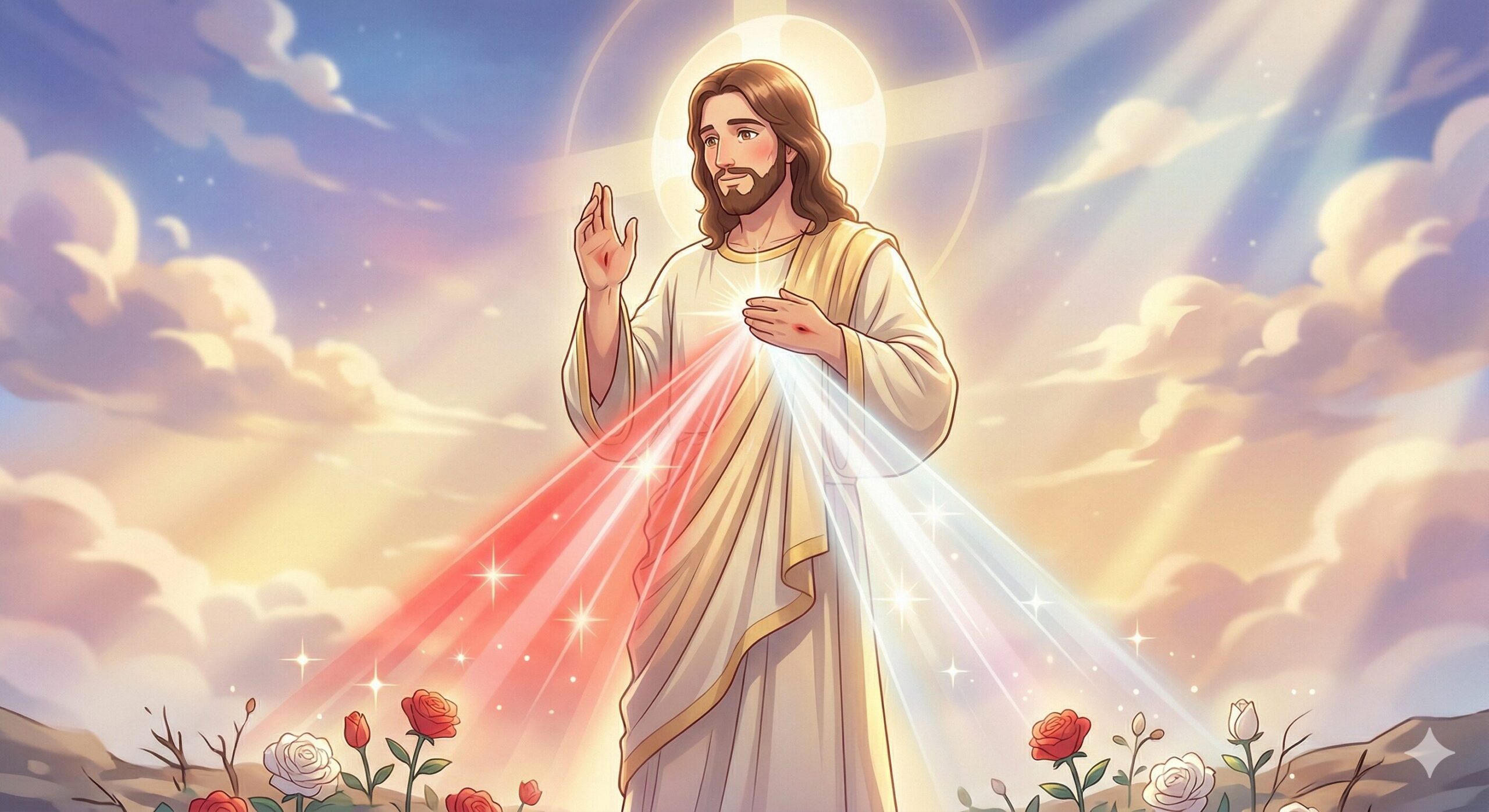 この主日に教会が強く思い起こすのは、聖ファウスティナを通して広められた神のいつくしみへの信頼です。主イエスは、祝福の手を上げ、胸元から赤と白の二つの光を放つ姿で示されました。伝統的にこの二つの光は、十字架上で主の脇腹から流れ出た血と水を表しています。